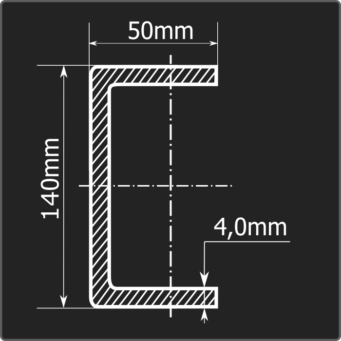 Швеллер стальной холоднокатаный гнутый равнополочный 140*50мм, толщиной 4,0мм и длиной 12м. Материал - углеродистая сталь. Соответствует требованиям ГОСТ 8278-83.