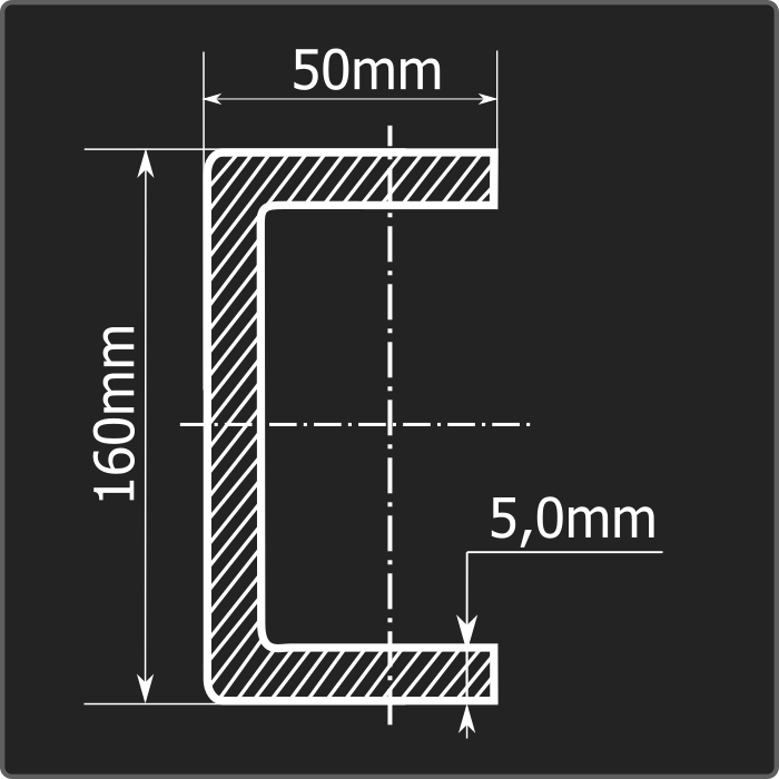 Швеллер стальной холоднокатаный гнутый равнополочный 160*50мм, толщиной 5,0мм и длиной 12м. Материал - углеродистая сталь. Соответствует требованиям ГОСТ 8278-83.