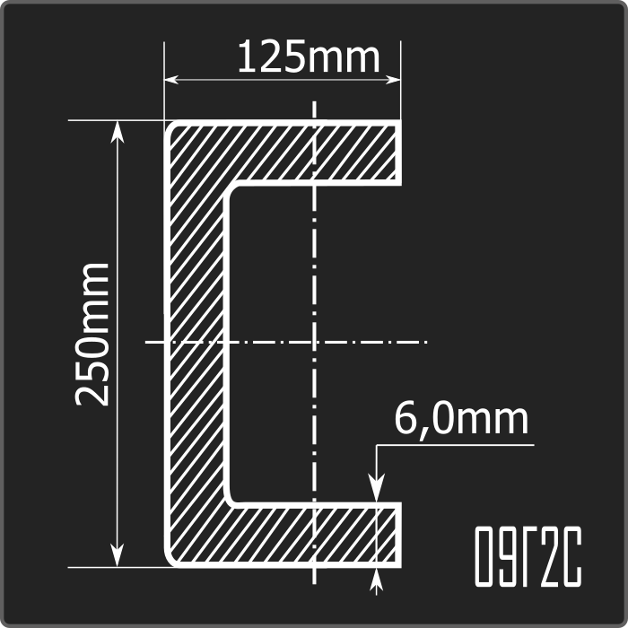 Швеллер стальной холоднокатаный гнутый равнополочный 250*125мм, толщиной 6,0мм и длиной 12м. Материал - низколегированная сталь. Соответствует требованиям ГОСТ 19281-2014.