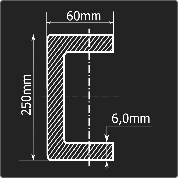 Швеллер стальной холоднокатаный гнутый равнополочный 250*60мм, толщиной 6,0мм и длиной 12м. Материал - углеродистая сталь. Соответствует требованиям ГОСТ 8278-83.