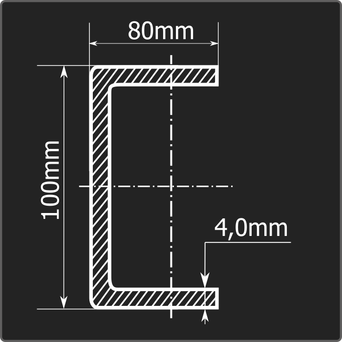 Швеллер стальной холоднокатаный гнутый равнополочный 120*80мм, толщиной 4,0мм и длиной 12м. Материал - углеродистая сталь. Соответствует требованиям ГОСТ 8278-83.