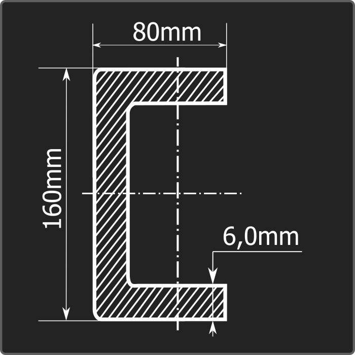 Швеллер стальной холоднокатаный гнутый равнополочный 160*80мм, толщиной 6,0мм и длиной 12м. Материал - углеродистая сталь. Соответствует требованиям ГОСТ 8278-83.