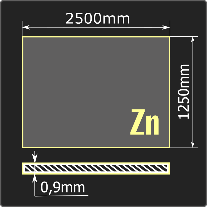 Лист стальной оцинкованный толщиной 0,9мм, шириной 1250мм и длиной 2500мм. Сталь 08пс. Соответствует требованиям ГОСТ 14918-2020.