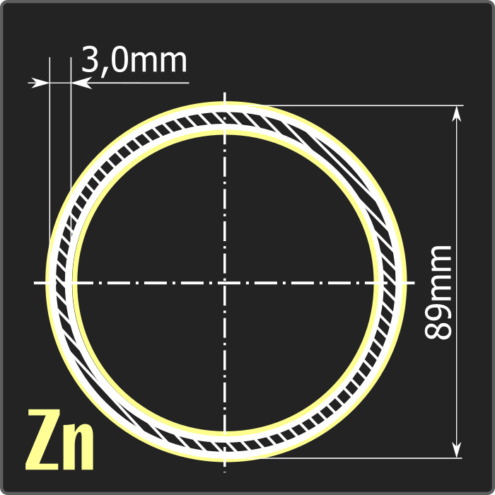 Труба электросварная стальная оцинкованная диаметром 89мм, толщиной 3,0мм и длиной 6м. Тип покрытия – горячее цинкование ГОСТ 9.307-89. Материал - углеродистая сталь. Соответствует требованиям ГОСТ 10705-80.