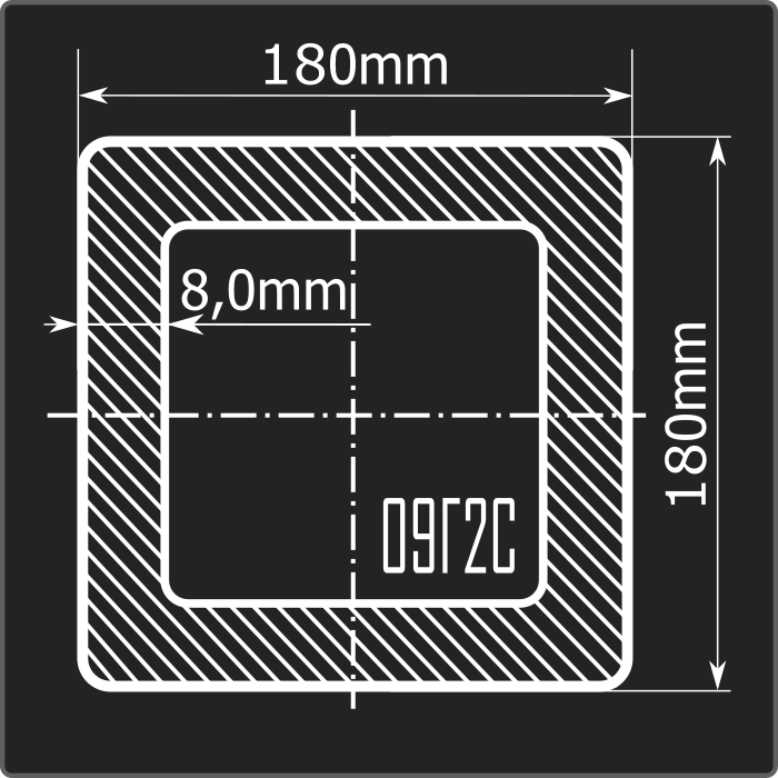 Труба профильная стальная квадратного сечения 180*180мм, длиной 12м и толщиной 8,0мм. Материал - низколегированная сталь. Соответствует требованиям ГОСТ 30245-2003. Стандартный пакет: вес - 4,480тн., количество - 9шт.