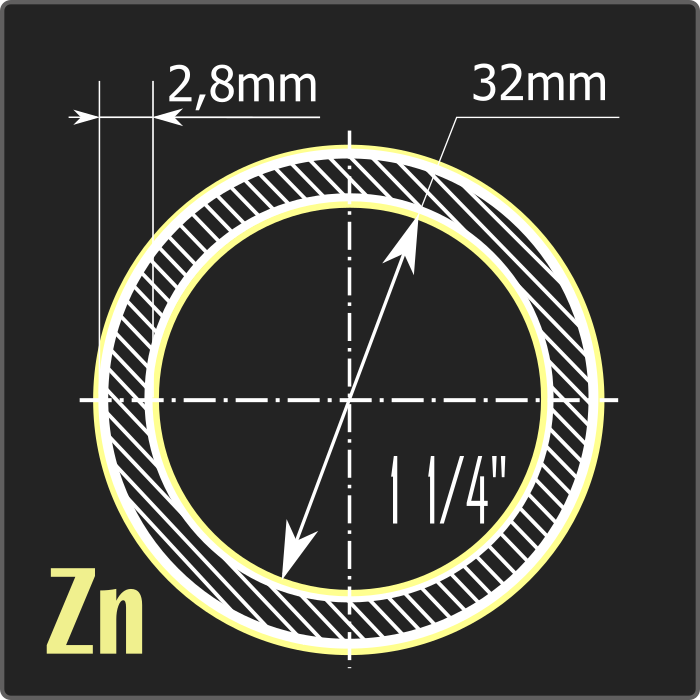 Труба стальная водогазопроводная оцинкованная внутренним диаметром DN 32мм (1 1/4"), толщиной 2,8мм и длиной 6м. Тип покрытия – горячее цинкование ГОСТ 9.307-89. Материал - углеродистая сталь. Соответствует требованиям ГОСТ 3262-75.